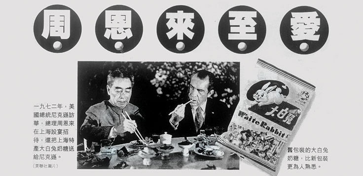 1972年美國(guó)總統(tǒng)尼克松訪華期間,其隨行人員先行來到上海,覺得大白兔奶糖香甜可口,就推薦給了尼克松。尼克松吃后也非常喜歡,周總理知道后,當(dāng)即批示將大白兔奶糖作為禮物送給尼克松。 大白兔作為國(guó)禮贈(zèng)送美國(guó)總統(tǒng)后,海外市場(chǎng)的大門欣然為大白兔開啟,在其他國(guó)家也受到人們的追捧。周總理還把大白兔奶糖送給前蘇聯(lián)領(lǐng)導(dǎo)人。