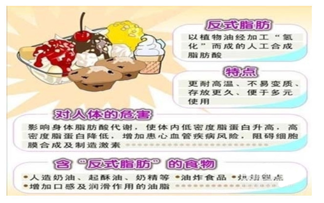 另一種是非天然的反式脂肪酸,它的制作工藝是把植物油通過人工催化加氫以后形成的,這種反式脂肪酸,雖然看上去和天然奶油一樣,而且可以起到和天然奶油一樣的效果,使制作出的糕點更加松軟有彈性,使炸雞和炸薯條更加香脆可口。但是這類反式脂肪酸對人體卻沒有什么好處,是人類健康的殺手。