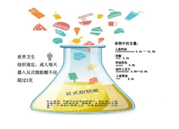 從代謝角度來看,順式脂肪酸代謝周期為7天,而反式脂肪酸在人體內的代謝周期長達51天。因為它們不容易被人體消化,因此會導致肥胖。而且,經常食用含有這類反式脂肪酸的食物,患冠心病、心腦血管疾病和阿爾茨海默病的幾率會增加。在懷孕期或哺乳期的女性如果食用這類食物,會影響胎兒或嬰兒的生長發育,患上必須脂肪酸缺乏癥,而且容易對中樞神經系統發育造成影響。